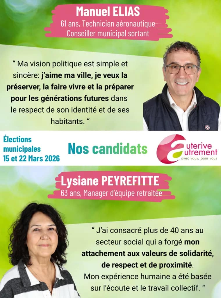 Déjà investie dans la vie communale actuelle, je souhaite poursuivre cet engagement au sein de l’équipe Auterive Autrement menée par Cathy Hoareau en mettant mon expérience humaine et professionnelle au service de tous.